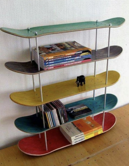 Используйте старые скейтборды для создания настенных книжных полок. Закрепите их на стене с помощью металлических креплений. Уникальные и яркие полки, которые добавят характер в комнату подростка.